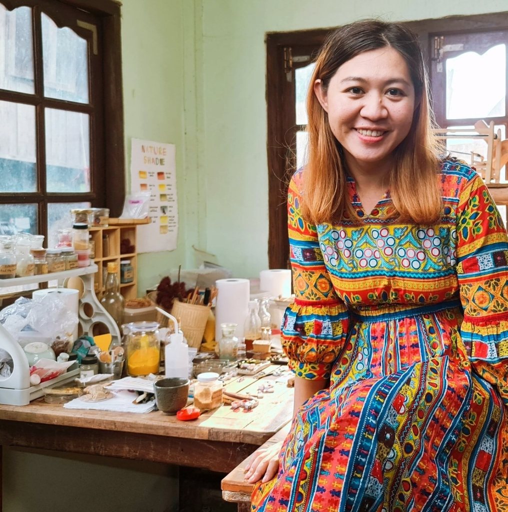 Pornpimon (Mew) Mingmitmee is a natural colour maker from Thailand. Pornpimon is an artist who has gained knowledge in science, art and archaeology, which she applies to her conservation work, where she preserves and repairs Thai painting and ancient murals. She has combined her knowledge with the local practices of dyeing to develop tourism in the Ban Nong San Community, Phu Phan District, Sakon Nakhon Province, to help preserve and develop the livelihood of north-eastern Thai artists.