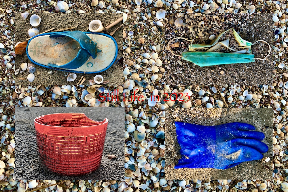 In May 2022, on the way from the south of Thailand to the north, I walked on a beach. It looked serene at first but then I noticed the beach was littered with plastic, which was thrown by the sea back onto the beach. It made walking over the beach almost impossible. It was disgusting. I made a lot of photographs of this garbage belt, carefully examining the objects, the arrangements of man-made objects, that do not move, contrasting them against a background which is in principle pristine. I thought, these are the new Still Life portraits of our contemporary society.