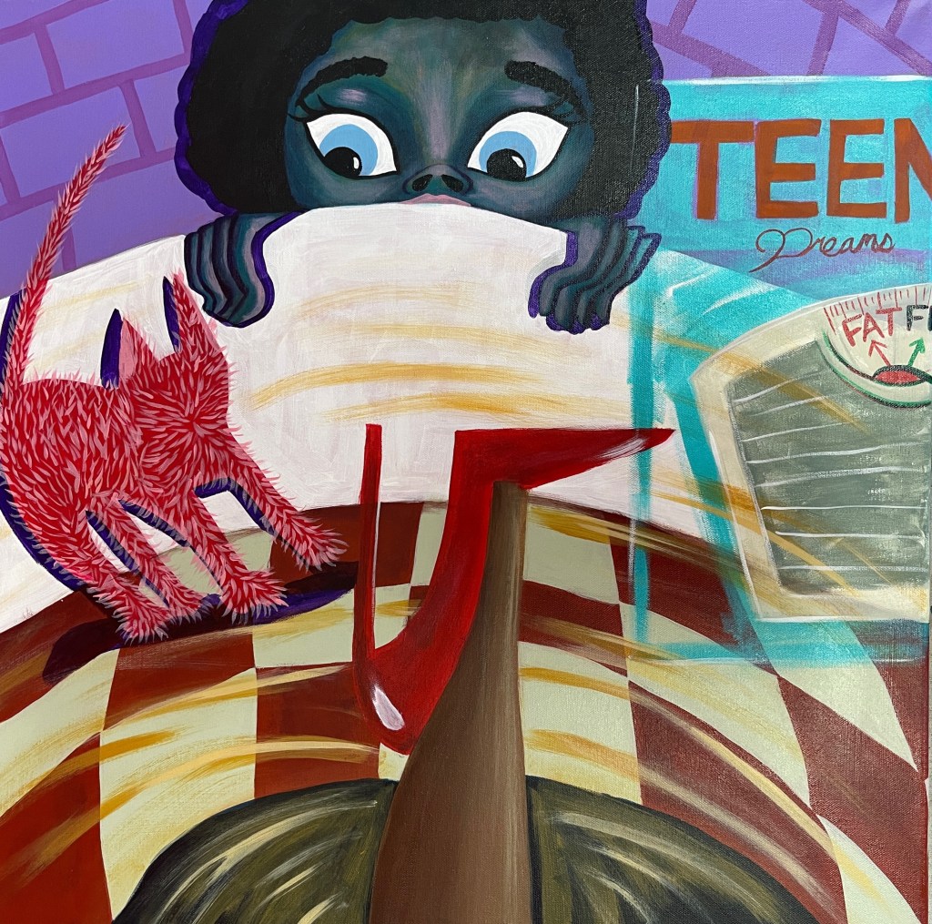We’re excited to welcome Abi Salami, an American contemporary artist originally from Lagos, Nigeria, to Studio 88. Known for her bold, surrealist paintings, Abi’s work explores the intersections of identity, culture, and the lasting impact of colonial histories. Her art challenges dominant narratives, using vivid imagery to confront themes of postcolonialism, education, and the complexities of personal and collective memory.