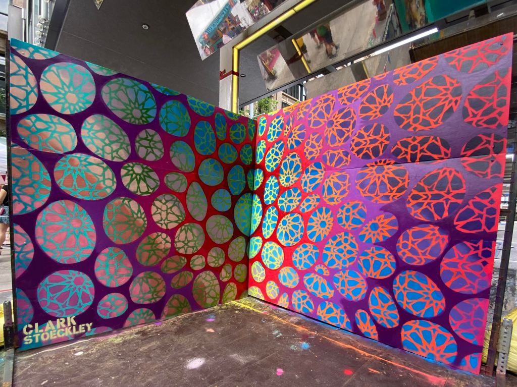 In contrast, Thoughts & Prayers turns inward, exploring ritual, repetition, and spirituality through geometric abstract drawing and painting. Influenced by sonic environments, sacred geometry, psychedelia, street art, and lived cultural dissonance—such as navigating vastly different political and spiritual contexts—these works seek harmony within chaos. What began as a meditative practice to preserve psychological and emotional well-being has evolved into a visual language that offers moments of balance, joy, and contemplation amid global unrest and media saturation.