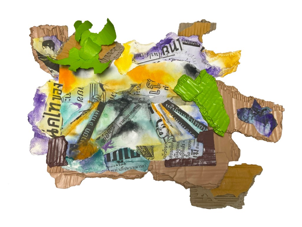 Rather than adhere to conventional concepts of identity, such as gender, race, origin or religion, artist Jameel Haiat utilizes his very personal experiences of pain, violence and trauma, as well as joy, to identify himself through his paintings and mixed medium work. Made with a variety of materials including torn paper, cardboard, spray paint and watercolors, each piece whether his paintings, his “Black” series, or his “Chiang Mai, Change Me” series reflect his experiences via deconstructive and reconstructive processes in an abstract, yet tangible visual manner while inviting viewers to experience his emotional identity and journey.